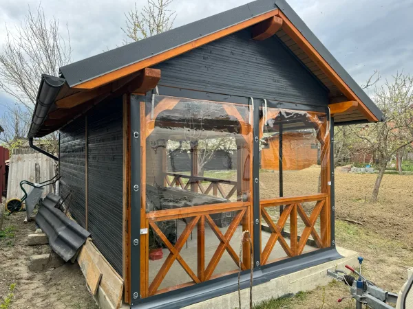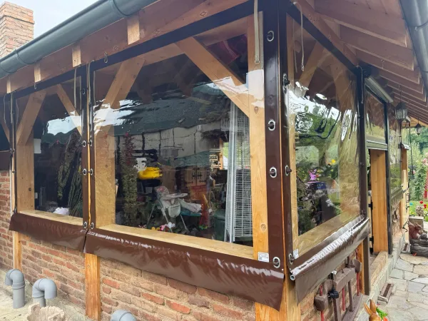 Sistemul de inchidere a terasei cu folie transparenta, cu capse si bride va poate ajuta atunci cand temperaturile sunt scazute, pe timp de ploaie, zapada sau vant. Acest sistem este foarte usor de instalat atat pentru foisoare cu structura din lemn cat si pentru terase.